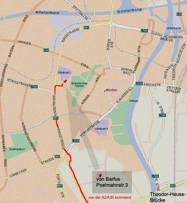 Richtung Minden/Barkhausen fahren, rechts durch den Wesertunnel bis zum Kreisverkehr; Kreisverkehr an der 2. Ausfahrt verlassen (Ringstraße, B61); nach ca. 1100 m (IKK-Gebäude auf der rechten Seite) rechts in die Roonstraße einbiegen; 1. Straße links in die Poelmahnstaße abbiegen; Ihr Ziel ist das zweite Haus auf der linken Seite.